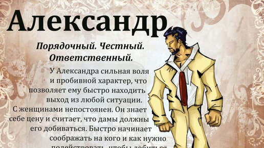 Мужское имя Александр по происхождению древнегреческое. В современном переводе значение трактуется как «защитник». В более ранней версии может означать «оберегающего мужа» (от мужчины, а не супруга). Имя Александр знакомо каждому. Включено не только в христианский именослов, но также и в свод еврейских имен. Люди с этим именем обладают хорошими чертами характера. По приданию оно наделяет человека чувством ответственности, которым обладало практическое большинство величайших людей… Популярность: Имя Александр занимает первое место по популярности в России...