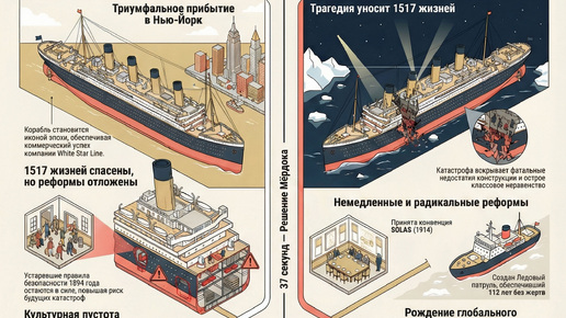 Представьте: 14 апреля 1912 года, 23:39. Впередсмотрящий Фредерик Флит видит что-то впереди — гигантскую тёмную массу, вырастающую из ночного океана. Он трижды ударяет в колокол и хватается за телефон. «Айсберг прямо по курсу!» До столкновения остаётся ровно 37 секунд. На мостике первый офицер Уильям Мёрдок принимает решение, которое войдёт в историю. «Право руля!» — кричит он рулевому. Одновременно даёт команду на реверс двигателей. Корабль начинает разворачиваться, но слишком медленно. Правый борт проходит вдоль айсберга, льдина вскрывает корпус на 90 метров...