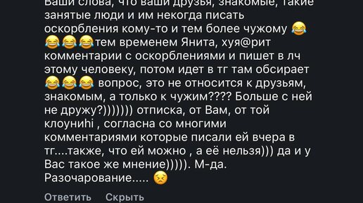 ? Что, слабо вступить со мной в спор, поругаться? Когда я даже была никем, я имела совесть ругаться с Настей Седовой со своего личного аккаунта, хотя меня вообще знать никто не знал тогда. И я свое всегда на хуй ненужное мнение писала по поводу неё со своих страниц) у меня нет фейков, я всегда заходила кого-то посмотреть именно со своего аккаунта, потому что мне не стыдно 😂 и мне не страшно) я всегда готова ответить за свои слова 24 на семь, а вы? 10:00 блядь утра, пятница. Я вообще сплю на хуй в своей кровати, на шелковых простынях...
