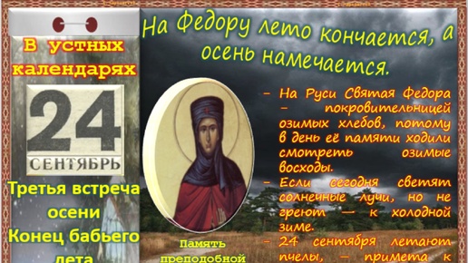 24 сентября - Традиции, обычаи и поверья, связанные с этим днём. Все праздники, которые отмечаются в этот день в разных календарях.