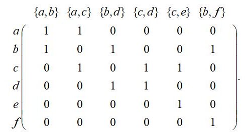 Определение 1. Пусть G – неориентированный граф. Пусть Mc – квадратная матрица, строки и столбцы которой обозначены вершинами неориентированного графа G. Элемент i-ой строки и j-гo столбца матрицы Mc, обозначаемый cij, равен единице, если имеется ребро из i-ой вершины в j-ую вершину, и равен нулю в противном случае. Матрица Mc называется матрицей смежности графа G. Заметим, что для сокращения записи обозначения строк и столбцов в матрицах смежности можно опускать, но рекомендуется их оставлять особенно в матрицах больших размерностей...