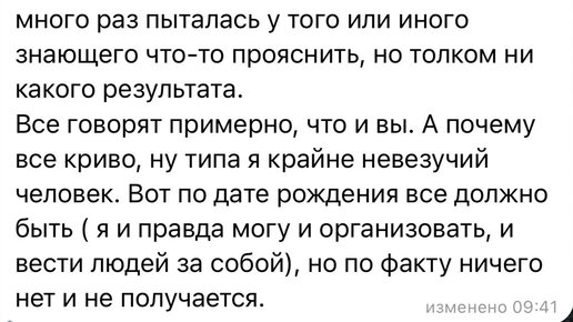 По дате всё есть, а по факту ХЗ что не так Это не полное сообщение от дамы. В начале она пишет как много усилий она вкладывает и как всё разваливается в итоге. При этом подтверждая, что она реально может организовывать и вести за собой Но всегда есть то самое НО Человек занимается сетевым бизнесом, в тг канале ок 4х тыс подписчиков, а результат не айс Моё 2х минутное аудио о её сильных сторонах, она прослушала спустя месяц. Моё сообщение на это послание висит не прочтённым еще месяц и похоже...