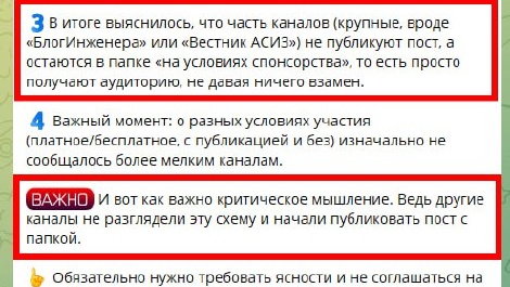 пост-расследование, согласно которому «Блог–Инженера» и «Вестник АСИЗ» участвуют в какой-то мутной схеме по привлечению подписчиков в свои телеграм-каналы. В итоге выяснилось, что часть каналов (крупные, вроде "БлогИнженера" или "Вестник АСИЗ") не публикуют пост, а остаются в папке "на условиях спонсорства", то есть просто получают аудиторию, не давая ничего взамен. Речь идёт о некой папке, в которой фигурируют, в частности, каналы Блог—Инженера и Вестник АСИЗ. При этом, по условиям инициатора...