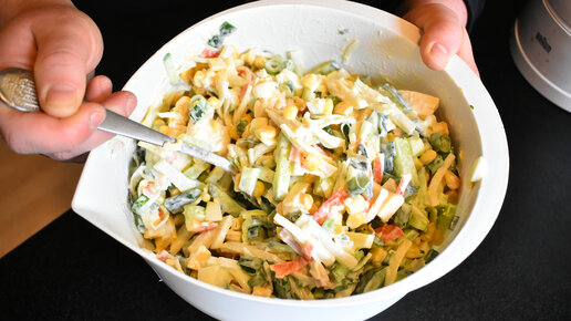 С самого утра сегодня муж сказал что очень хочет какой-нибудь вкусный салат (и отправился на работу). Я решила его порадовать и приготовить один из его любимых салатов. Готовлю сегодня салат из крабовых палочек с плавленным сыром. Такой салат я часто люблю готовить на праздники, но иногда и в обычные дни. С уверенностью могу сказать, что он всегда получается очень вкусным и со стола его сметают первым. Делюсь с Вами рецептом и советую обязательно приготовить! 👨🍳 Давайте уже готовить! Список продуктов я оставлю в конце статьи, для Вашего удобства...