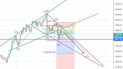 Здравствуйте, уважаемый читатель!В этой статье я выскажу свой прогноз дальнейшего движения BTC/USDT. Биткоин движется в нисходящем канале(красный канал).Если рассматривать на дневном ТФ, то у него, как бы это банально не звучало, два пути, либо вверх, либо вниз. Взглянув на инструмент с точки зрения волновой теории Эллиота, можно увидеть, что сейчас должна быть волна "С", а соответственно он направляется к отметке в 34000$(фиолетовая стрелка)(1.618 коррекция по Фибоначчи).Также он может пробить нисходящий канал вверх, тогда мы увидим штурм, как минимум в 48000$(Желтая стрелка)...