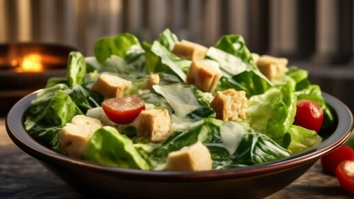 Ингредиенты: - 300 г куриного филе - 1 головка салата романо - 4 ломтика хлеба - 2 яйца - 50 мл оливкового масла - 60 мл белого винного уксуса - 0,5 ч.л. горчицы - 1 зубчик чеснока - 80 мл воды - 2 ч.л. лимонного сока - соль, перец по вкусу Приготовление: 1. Куриное филе нарезать на кубики и обжарить на сковороде до золотистой корочки. 2. Яйца сварить вкрутую, остудить, очистить и нарезать на дольки. 3. Хлеб нарезать на кусочки и обжарить на сухой сковороде до золотистого цвета...