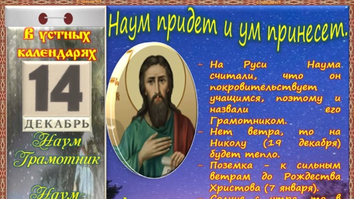 14 декабря - Приметы, обычаи и ритуалы, традиции и поверья дня. Все праздники дня во всех календарях.