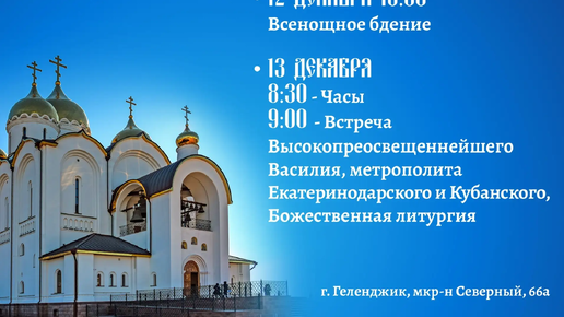 Престольный праздник Кафедрального собора святого апостола Андрея Первозванного В эту субботу в Геленджике православных верующих ждёт особое событие: престольный праздник Кафедрального собора святого апостола Андрея Первозванного, небесного покровителя нашего города-курорта и всего Черноморского побережья Кавказа. Что будет в эти дни 12 декабря в 16:00 в соборе Андрея Первозванного состоится всенощное бдение. 13 декабря в 8:30 начнутся Часы, в 9:00 — встреча Высокопреосвященнейшего Василия, митрополита Екатеринодарского и Кубанского, после чего будет совершена Божественная литургия...