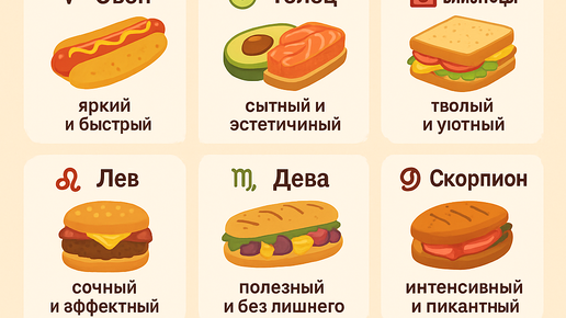 Астрология помогает узнать не только характер и судьбу, но и то… какой бутерброд отражает твою сущность! 😋 Давай посмотрим, что выбрали звёзды для каждого знака. Яркий, горячий и быстрый! Овен не будет долго возиться — схватит хот-дог на бегу и пойдёт покорять мир. Тельцы любят вкусную, сытную и эстетичную еду. Всё красиво уложено, сбалансировано и максимально инстаграмно. Две половинки — сладкая и солёная, как две стороны Близнецов. И всегда весело! Домашний уют в еде. Для Рака важно, чтобы было тепло и вкус детства...