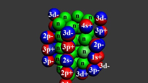 Железо – Fe. Химический элемент с чётным зарядом имеет четыре стабильных изотопа: 54Fe(5,82%) спин/чётность J = 0+. 56Fe (91,66%) спин/чётность J = 0+. 57Fe(2,19%) спин/чётность J = 1/2+. 58Fe(0,33%) спин/чётность J = 0+. С любым другим спином, кроме J = 0, J = 1/2 ядро атома железа быстро распадается. Ядро изотопа атома железа 54Fe вид с торца 1. спин/чётность J = 0+. Ядро изотопа атома железа 54Fe вид с торца 2. спин/чётность J = 0+. Ядро изотопа атома железа 55Fe вид с торца №1. Добавка одного...