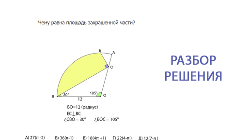 Первым шагом выполним несколько дополнительных построений: 1) построим полную окружность с центром О и радиусом АВ 2) продолжим отрезки ЕС и ВС до пересечения с окружностью, достроим радиус АО до диаметра AG Далее вычислим значения некоторых углов: 1) Из Δ ВСО: ∠BCO=180° - (∠СВО+∠СОВ)= 180° - (30°+105°)=45° 2) ∠ACF=∠BCO=45° (вертикальные) 3) ∠ECA=180° - (∠BCO+∠ECB)=180° - (45°+90°)=45° Ищем значение дуги ВЕ: 1)⌒EA = ⌒AF 2) ⌒ BG = 180°-105°=75° 3) (⌒ BG+⌒AF)/2=∠ACF ⇒ (75°+⌒AF)/2=45°⇒⌒AF=15° 4)...