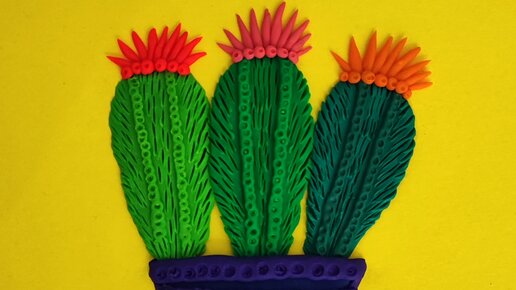 Аппликация из пластилина на цветном картоне " Кактусы в горшочке". Пошаговая инструкция с фото для детей.
