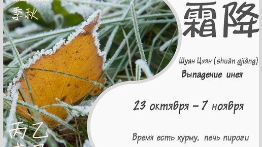 По китайскому календарю 23 октября начинается сезон Шуан Цзян (Выпадение инея, кит. 霜降 ) – восемнадцатый малый сезон из 24 сезонов традиционного китайского календаря, который продлится до 7 ноября. Продолжается третий месяц осени 季秋 (и последний из Осенних сезонов), ежегодно он наступает 22-24 октября, когда эклиптическая долгота солнца достигает 210°. В древних китайских текстах об этом времени говорится: «Вода росы скапливается и застывает, покрывает поверхность земли в виде инея тонким слоем. Дыхание-ци сезона соединяется с дыханием-ци сезона Холодные Росы, и становится еще холодней...