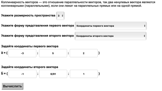Данный калькулятор проверит являются два вектора коллинеарными (параллельными) и даст подробное решение. Для записи десятичной дроби используйте точку либо запятую (например, 1.12 или 1,12), для ввода обыкновенных дробей воспользуйтесь знаком «/» (например, 1/2 или 3/4) https://matematika-club...