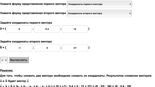 Данный калькулятор вычислит сумму и разность векторов и даст подробное решение всех этапов вычисления. Для записи десятичной дроби используйте точку либо запятую (например, 1.12 или 1,12), для ввода обыкновенных дробей воспользуйтесь знаком «/» (например, 1/2 или 3/4) https://matematika-club...