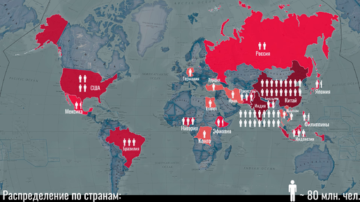 Сегодня я вам расскажу про население земли понятным языком. Вот у нас есть 100 человечков, и с их помощью я вам наглядно продемонстрирую население нашей планеты. Из нашей сотни 18 сразу отправятся в Китай, 18 в Индию – две самые густонаселенные страны мира. 4 гринго в США. По 3 человека в Индонезии, Пакистане, Нигерии и Бразилии. 2 в Бангладеше. Почти целых два россиянина живет в России. По 1.5 человека (как это физически не спрашивайте, всё усредняем) в Мексике, Японии, Эфиопии и Филиппинах. И по одному индивидууму в Египте, Вьетнаме, Конго, Турции, Иране, Германии и Таиланде...
