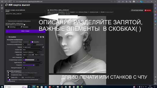 Несколько простых шагов: Придумайте вашу композицию и опишите её на английском языке. Важно разместить слова в запросе по мере значимости, например : JEWELRY, GIRL в этом случае возможно будет на заднем плане девушка , а акцент сделан на украшении или наоборот GIRL, JEWELRY ,в этом случае вы полчите изображение девушки в украшениях. На самом деле процесс создания запросов для ИИ очень занимателен и похож на ребус. Для описания на английском языке можно использовать онлайн переводчик Теперь немного...