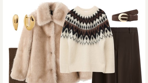 Нежная карамель, молочная пена и горький шоколад — палитра этого комплекта заставляет влюбиться с первого взгляда. Образ одновременно уютный и очень современный: благородные фактуры, мягкие линии и продуманная геометрия. Разберём всё строго по порядку, как на фото — сверху вниз, слева направо. Массивные, но гладкие — без лишней гравировки, с мягким бликом. За счёт округлой формы серьги «смягчают» графику брюк и рисунка на свитере, при этом собирают образ благодаря тёплому металлическому акценту...