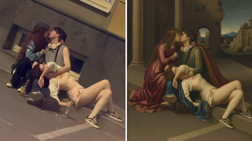 Случайный Ренессанс: Вирусное фото целующейся парочки и спящей рядом с ними подруги стало объектом арт-пародий