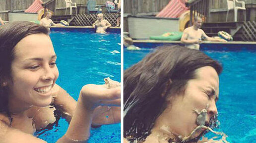 Все мы с вами любим позировать и делать фотографии. Но порой, к сожалению или счастью, наши фотографии получаются спонтанными, над которыми можно не только надорвать свой живот, но и рассмешить других людей. Давайте же взглянем, на 15 таких смешных, нелепых и просто сделанных фотографий в нужном месте, в нужное время. 1. Лягушачий поцелуй. Когда эта девушка обнаружила лягушку в бассейне, ей показалось хорошей идеей сделать с ней фотографию. Но вот, что-то мне подсказывает, что лягушка не совсем оценила её намерения и решила поскорее удрать от неё...