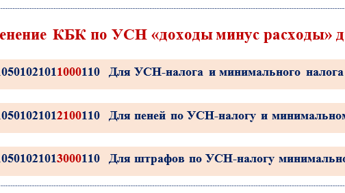 КБК 18210501021011000110: как было и как стало Для расшифровки КБК 18210501021011000110 в 2023-2024 годах важно понимание произошедших в законодательстве изменений в правилах уплаты налогов и порядке применения кода до их введения. С 2019 по 2023 год КБК 18210501021011000110 использовался при применении УСН с объектом «доходы минус расходы» в таком порядке: ФНС именовала этот КБК единым и предписывала использовать при применении УСН с объектом «доходы, уменьшенные на величину расходов» для перечисления налога и минимального налога, а также штрафов и пеней по ним...