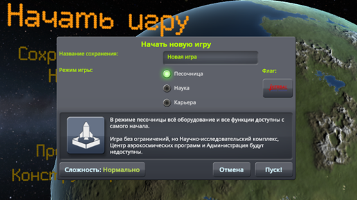 Новая игра доступна в трех режимах: "Песочница", "Наука" и "Карьера". Так же можно выбрать уровень сложности, чем выше уровень сложности, тем больше привилегий отсутствует, к примеру, нельзя отменить полет, можно нечаянно разрушить взлетную полосу и многое другое...