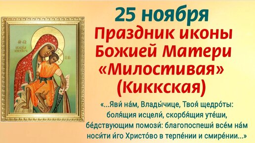 25 ноября Православной Церковью празднуется День иконы Божией Матери «Милостивая» (Киккская). Это один из самых почитаемых образов Богородицы, и вместе с тем, этот образ самый таинственный и имеет замечательную особенность - ведь видеть эту икону и знать, что же на ней изображено, мы по сей день можем только из дошедших до нас списков. Сама же чудотворная икона Киккская находится на острове Кипр в Киккском монастыре, который был построен специально для этой иконы. Этот образ Богородицы уникален - подойти и помолится к иконе могут абсолютно все, а вот приложится - никто...