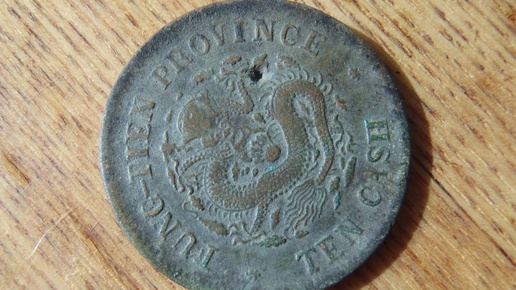 Есть в моей коллекции весьма интересный артефакт, который долгое время лежал в российской земельке. Это большая монета, на которой изображен дракон. Вот так она выглядит: Надпись на монете, сделанная на латинице - ten cash fung-tien province - позволила мне найти в Интернете почти всю информацию о монете. Во-первых, монета относится к самому началу 20 века. В исследовании я пошел дальше и нашел табличку, с помощью которой перенес китайские иероглифы в арабские цифры. Получился год - 1908, хотя возможно я ошибаюсь (если кто разбирается, то можете в комментариях написать правильный год)...