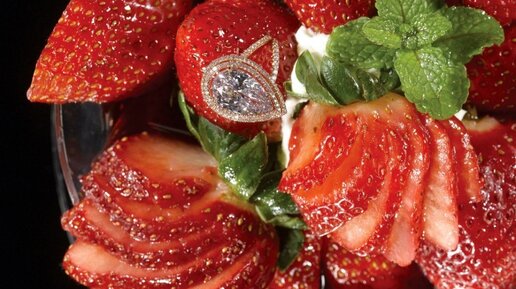 На наши деньги это 88 млн рублей. На них можно купить 30 яхт за 3 млн руб. Почему же она такая дорогая? Дело все в приготовлении десерта. Клубнику замачивают в дорогом вине. А украшают блюдо бриллиантом розового цвета (4,7 карата) от известного ювелирного дома Ernest Kessel, кольцо из розового золота (18 карат) и мятой...