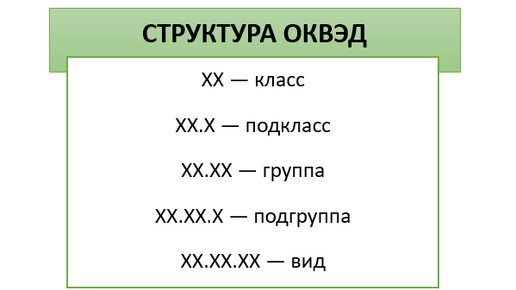 Роль ОКВЭД ОКВЭД — общероссийский классификатор видов экономической деятельности. В 2024 году действует ОКВЭД-2, утвержденный приказом Росстандарта от 31.01.2014 № 14-ст. Зарегистрировать организацию или ИП без указания ОКВЭД нельзя. Указание кода вида деятельности в заявлении на регистрацию — обязательное условие оформления бизнеса. ОКВЭД имеет следующую структуру: При регистрации бизнеса следует указывать не менее четырех символов ОКВЭД, то есть код не выше группы. Какие коды ОКВЭД подпадают под УСН в 2023 -2024 годах, читайте в статье...