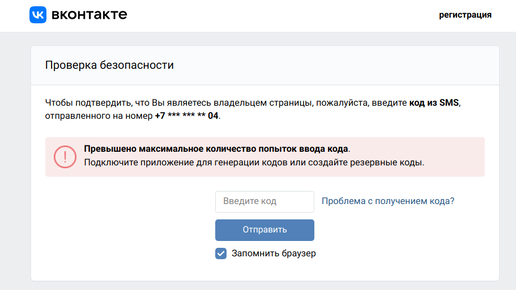 VKontakte - Превышено количество попыток ввода кода