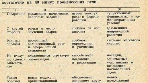 Данный универсальный код был написан в 1956 году и предназначался для использования "ленивыми" политиками. С помощью этой таблицы, содержащей 10000 комбинаций предложений, вы можете вещать минимум 40 минут без остановки...