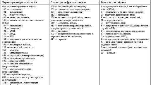 ВУС: что это В вооруженных силах России есть свои специальности. Для их обозначения и используются коды военно-учетной специальности (ВУС). Коды состоят из шести цифр и буквы. Они помогают учитывать военных специалистов и быстро распределять в войсках в случае необходимости. Коды ВУС играют важную роль в системе военного учета и позволяют точно определять квалификацию и опыт каждого военнослужащего. Присваивается код: За время службы у человека может быть несколько кодов ВУС. Это связано со сменой специальности и продвижением по служебной лестнице...