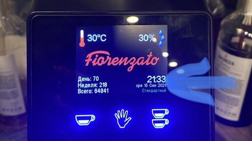 Привет, привет. Продолжаю цикл статей об устройстве кофемолки Fiorenzato. В этой мы коротко разберем дисплей, функциональные кнопки и обозначения влияющие на помол. Поехали В правом верхнем углу нас встречает обозначение влажности внутри кофемолки. В зависимости от значения может меняться консистенция помола и степень комкования. Приемлемыми можно считать значения до от 10% до 40% влажности, дальше начинаются достаточно серьёзные изменения в помоле и вкусовых характеристиках напитка. В левом верхнем у нас температура...