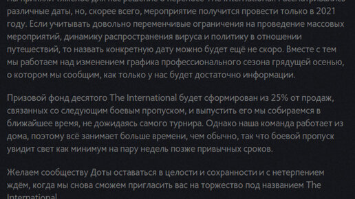 Главное событие года в мире Dota 2 уже приближается, это The International 2020. Юбилейное состязание по Доте 2 от Valve в этот раз перенесено в Стокгольм. Первый день грандиозного события обозначен 18 августа, а гранд-финал пройдет 23 числа. Перенос The International 2020 на 2021 год Компания отменила проведение The International 2020 в 2020 году. В обращении говорится, что с большой вероятностью TI пройдет в 2021 году. Официально обращение ниже на изображении. Призовой фонд The International 2020 На данный момент не известно, сколько же в этот раз составит призовой фонд...