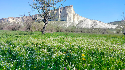 Весной! Почему? Нет изнуряющей жары. Полуостров цветёт и благоухает. Это самое красивое время года в Крыму. Середина весны. Склон гор, долины, степи покрыты цветущим разнотравьем. Белая Скала. (Ак-Кая) Миллионы лет назад эта скала находилась под водой бушующего древнего океана Тетис. Отголоском этого являются раковины организмов, жившие в Юрский период, которые находят до сих пор у подножия скалы. Пролетели над Землёй столетия… Белая Скала стала пристанищем древнего человека. Археологи нашли в гротах и пещерах скалы 20 стоянок людей эпохи Палеолита...
