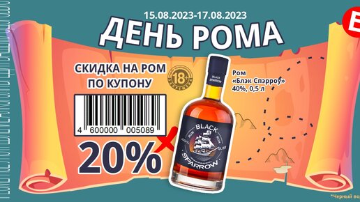 Какой крепкий напиток ассоциируется с бочкой, пиратскими кораблями и белоснежно-песчаными пляжами? Конечно, ром! Это по-настоящему экзотический и ароматный напиток с богатой историей. В честь всемирного Дня рома в «Бристоль» в период с 15 по 17 августа 2023 года действует скидка по купону – 20% на ром «Блэк Спэрроу»! Напиток имеет хорошо сбалансированный, мягкий вкус с нотками тропических фруктов, ванили и оттеняется сладковатым послевкусием. *Подробности уточняйте в магазинах Бристоль; Почему ром тесно «связан» с Карибами? Ежегодно 16 августа отмечается всемирный День рома...