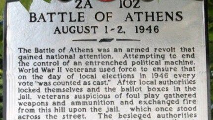 Документальная статья о восстании ветеранов Второй Мировой войны в городе Афины, штат Теннесси 1 августа 1946 г.