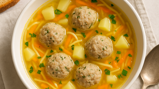 Суп с фрикадельками — универсальное блюдо, которое любят и взрослые, и дети. Оно готовится быстро, легко усваивается и отлично подходит как для повседневного, так и для диетического питания. Этот суп особенно хорош в холодное время года — он сытный, ароматный и очень уютный. На 6 порций: На этом этапе можно приготовить лёгкую зажарку: Суп с фрикадельками — это гастрономический уют в тарелке...
