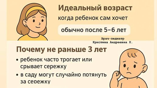 Когда можно прокалывать уши ребенку? Один из самых частых вопросов от родителей девочек 😊 ✨На мой взгляд, идеальный возраст — тогда, когда ребенок сам хочет. Обычно это происходит после 5–6 лет. В этом возрасте ребенок уже осознанно относится к процедуре, понимает, зачем это нужно, и способен ухаживать за проколами. ❗️Почему не рекомендую до 3 лет: ➡️Малыши часто трогают или срывают сережки — это риск травмы и инфицирования. ➡️В детском саду кто-то может случайно потянуть за сережку. ➡️У маленьких...