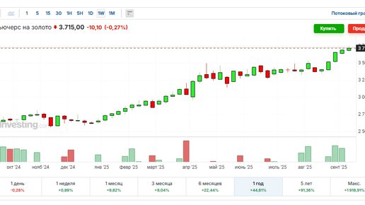 Разберу текущую ситуацию с золотом. Начнем с динамики. Цена за тройскую унцию в мире перевалила за 3700 долларов, в течение нынешнего года она уже неоднократно обновляла абсолютный максимум. Рост начался с января, продолжался практически планомерно, и за это время с начала года золото подорожало почти на 40% в долларах. Если же рассматривать динамику цену на золото в рублях (а в России его, как ни крути, покупают и продают за рубли), то она хуже. С начала года золото, наоборот, падало в цене к рублю (из-за сильного укрепления рубля)...