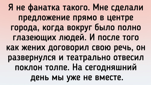Предложение выйти замуж — одно из наиболее волнительных и романтичных событий в жизни. Казалось бы, что может испортить такой момент? А вот, например, полное отсутствие приватности. Мы ознакомились с историями пользователей сети и обнаружили любопытную закономерность: предложение в присутствии наблюдателей лишь в крайне редких случаях заканчивается счастливым браком. Я не фанатка такого. Мне сделали предложение прямо в центре города, когда вокруг было полно глазеющих людей. И после того как жених договорил свою речь, он развернулся и театрально отвесил поклон толпе...