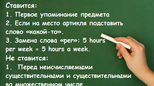 Используется, когда мы говорим о чем-то в первый раз или когда предмет не конкретный. A ставится перед словами, начинающимися с согласного звука: An ставится перед словами, начинающимися с гласного звука: Используется, когда говорим о чем-то конкретном или уже известном из контекста. Когда объект уже известен собеседнику: Когда есть только один такой объект: Перед названиями уникальных мест и объектов: С названиями морей, океанов,...