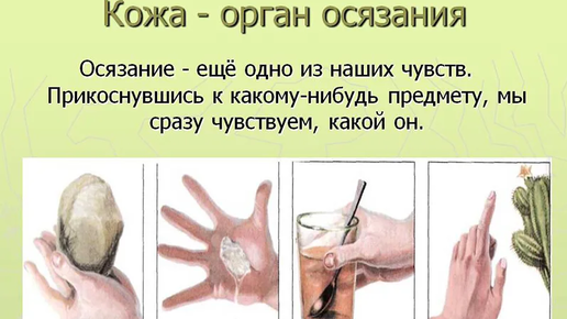 Урок: мир природы и человека Тема: Кожа – орган осязания Цель: формирование представления о том, что человек познаёт окружающий мир с помощью органа осязания – кожи Задачи: - дать обучающимся элементарные представления о значении кожи; развивать умения отвечать полными предложениями; - корригировать и развивать память, мышление через временные представления и знакомства частью лица; расширить словарный запас; - воспитывать интерес к предмету, уважительное отношение друг к другу, наблюдательность...