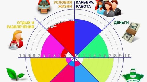 ⦁ Сделайте анализ удовлетворённости в каждом секторе (обычно по шкале от 1 до 10) и соединяет точки, образуя «колесо». Это визуализирует несбалансированность и подсказывает направления для персонального роста...