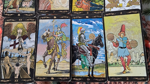 Вопрос 1: Кто и как влюблен? (Паж Мечей, 7 Кубков, 3 Мечей, Колесо Фортуны, Суд)