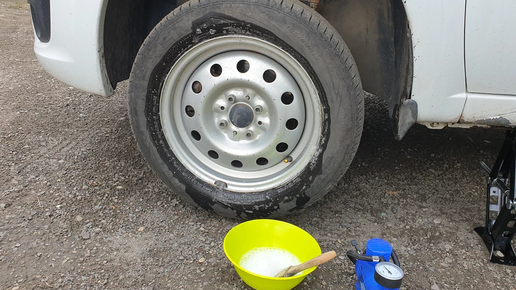 Колесо понемногу спускает из под бортов, рассказываю про отличный способ без обращения в шиномонтаж