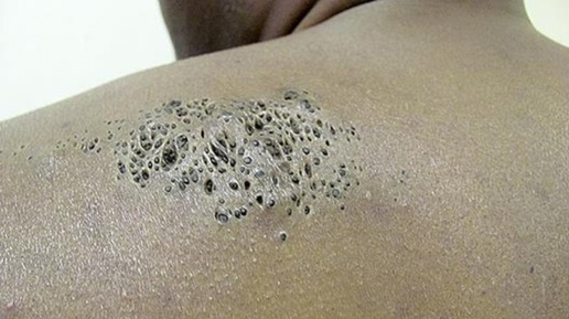 43-Летний чернокожий мужчина, работавший уборщиком, родившийся и проживавший в Рио-де-Жанейро, был направлен в наше отделение в связи с поражением левой надлопаточной области, которое у него было с рождения и прогрессировало до 5-летнего возраста, распространяясь на левую руку и предплечье. Клинический аспект и распространение поражения вызвали соответствующие психосоциальные последствия, главным образом в подростковом возрасте, в результате чего он стал предпочитать носить рубашки с длинными рукавами, избегать пляжей и плавательных бассейнов, что также повлияло на его эмоциональные отношения...