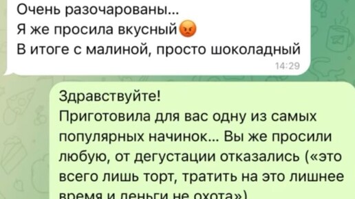 "Здравствуйте! Попала в неприятную и неоднозначную ситуацию. У меня заказали торт по акции дизайн-сюрприз, причем начинку тоже оставили на мой выбор. Я сделала одну из самых популярных начинок, которая у меня была на тот момент. Начинка была нейтральная, не кричащая, не вычурная. И вот спустя неделю (!!!) получаю такие странные сообщения от заказчицы." Вкус торта оказался "самым обычным". Вернете деньги или нет? " Как думаете, на дурачка, внаглую, решили деньги обратно получить или реально недовольны?...
