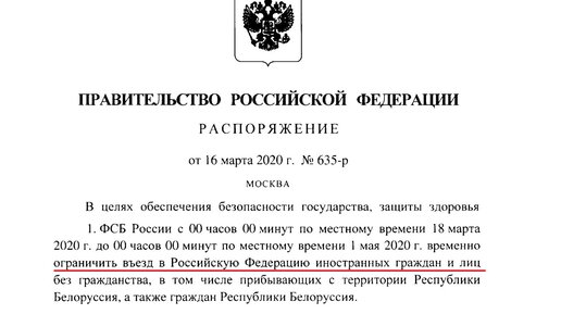 На период карантинных мер для борьбы с короновирусом действует ряд ограничений. Самая первая и очень важная – запрет на въезд в Россию иностранных граждан. Россия - первая страна в мире, которая закрыла границы сначала с Китаем, а затем и с остальным миром. Именно закрытие границ остановило завоз вируса иностранцами. И, кстати, возможное закрытие границ из-за вируса было предсказано нашими юристами за несколько дней. Закрытие границ с другими странами закреплено документом - Распоряжение Правительства № 635-р от 16 марта 2020 г...